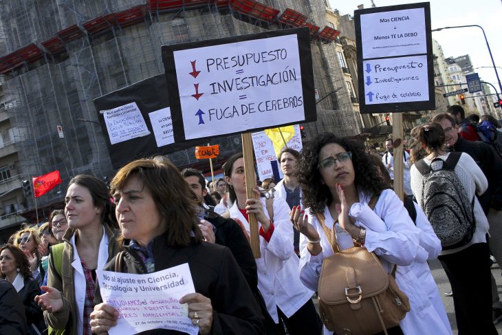 El recorte en el presupuesto, afirman los diversos espacios, no sólo atenta contra el desarrollo emprendido en varios ámbitos de la ciencia, sino que además amenaza con una nueva “fuga de cerebros”, que en los 90 fue la salida encontrada por miles de profesionales ante la indiferencia del gobierno. “Defender la ciencia para que nuestros científicos, sus ideas y sus conocimientos no se vean obligados a volar de la Argentina”, rezó uno de los tantos carteles presentes en la movilización. Algunos científicos decidieron “lavar los platos en la plaza”, en alusión a la frase del ex ministro de Economía Domingo Cavallo, emblema de la desidia hacia el sector. “Parece que no aprendemos más”, se escuchó decir a las jóvenes científicas que montaron la escena simbólica.