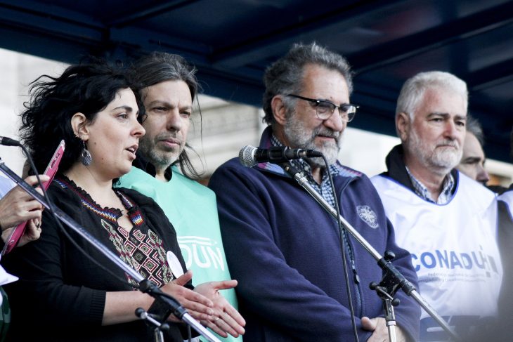 Pese al fuerte viento, las banderas se mantuvieron firmes durante el acto central de una jornada de protesta que reunió a gremios docentes, agrupaciones estudiantiles e investigadores de todo el país, y que tuvo sus réplicas en otras provincias, como Córdoba o Río Negro. Bajo el lema “No al ajuste en ciencia, tecnología y universidad”, colmaron el frente del Congreso, para pedirle a diputados y senadores que no aprueben el proyecto de presupuesto que envió el gobierno de Mauricio Macri, y para insistir con el fin del ajuste para ambos sectores. “La jornada de hoy es para reclamar ante el Congreso el rechazo del proyecto de presupuesto y su modificación, porque entendemos que tiene un recorte tanto para las universidad como para ciencia y técnica”, explicó Daniel Ricci, titular de la Federación de Docentes de las Universidades (FEDUN). Junto con otras organizaciones sindicales como CONADU y CONADU Histórica, se hicieron presente además para pedir la reapertura de paritarias, ya que entienden que “el 35 por ciento de aumento, con una inflación que el propio gobierno admite superior al 40 por ciento, estamos teniendo un ajuste y recorte de nuestro salario, que no estamos dispuestos a tolerar”.