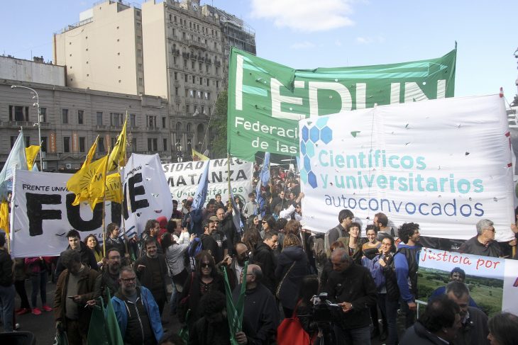 La federación marchó junto a un amplio grupo de investigadores, trabajadores y gremios para protestar contra el recorte en el presupuesto de la educación pública superior y la ciencia. “Tenemos que exigir un cambio en las políticas económicas”, dijo Daniel Ricci, titular de FEDUN. El documento consensuado rechazó el proyecto del gobierno, y pidió un “aumento sustancial”. También se reclamó por las paritarias: “perderemos más de 10 por ciento de salario real”.