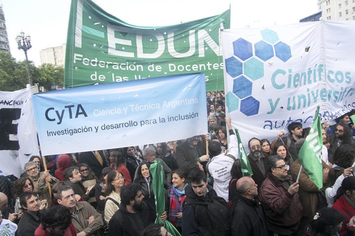 El escenario, ubicado a la sombra del edificio del Congreso, se fue colmando, y apenas pasadas las 16 estaba lleno. Enfrente, una multitud, con banderas y consignas, se fue agrupando, a medida que las columnas ingresaban a la plaza. De a poco, los docentes universitarios, trabajadores del sector, investigadores y estudiantes le dieron color a una heterogénea concurrencia, que se movilizó bajo un solo objetivo: rechazar el ajuste en el presupuesto de la educación pública superior y la ciencia. Para esto, los referentes de los espacios consensuaron un duro documento, donde se hizo un “enfático rechazo” al recorte de más del 30 por ciento de los fondos de ambas áreas para el 2017. Además de recuperar ese dinero, se pidió por un “aumento sustancial” de las partidas, y que se reabran las paritarias del sector. Como pocas veces, las diferencias quedaron de lado, y la defensa del conocimiento público argentino fue el eje de la jornada. Hubo duras críticas al ministro Lino Barañao, que parece perdió el apoyo de sus pares.