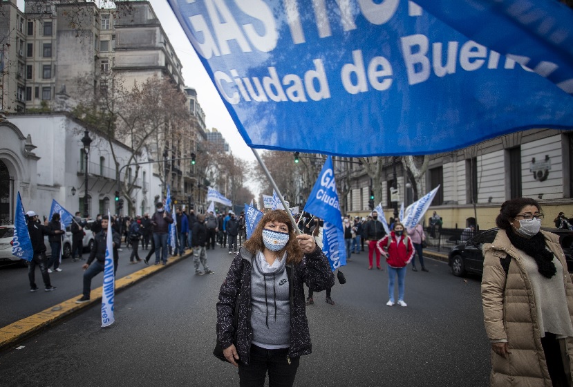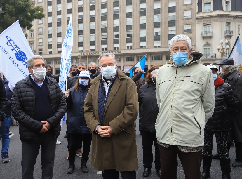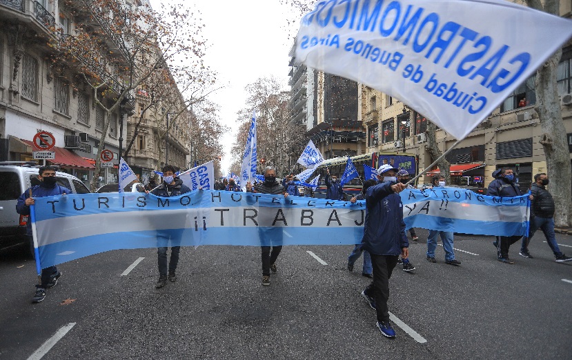 Tras registrarse ayer la mayor cantidad de nuevos contagios en un solo día, el titular del gremio de hoteleros y gastronómicos, Luis Barrionuevo, realizó una caminata con una muy exigua concurrencia hasta Plaza de Mayo, con el respaldo de las cámaras empresarias, y el cotitular de la CGT, Carlos Acuña, para presionar al gobierno nacional y pedir que se reabra la actividad del sector en todo el país.